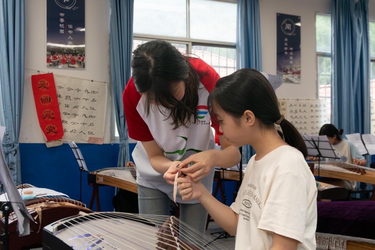 图为 寨阳小学学生在志愿者引导下弹古筝 通讯员 廖柯 供图