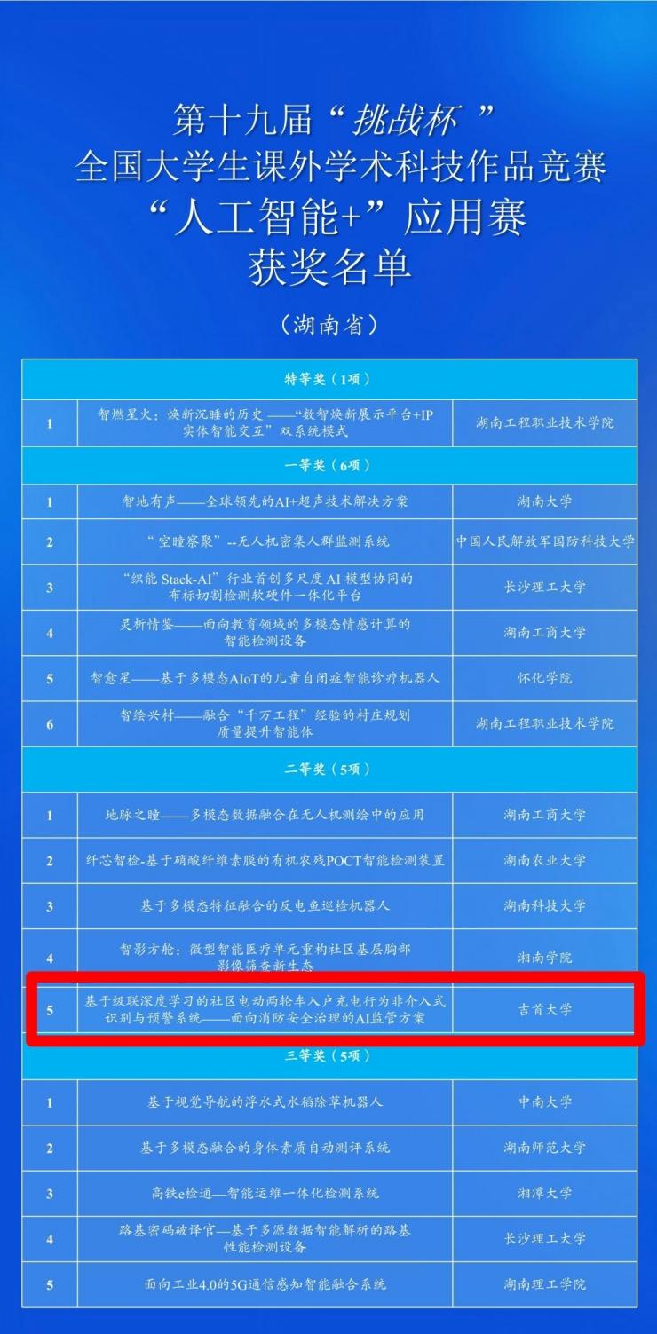 (通讯员 周传芳 廖茂翔)近日,第十九届“挑战杯”中国移动全国大学生学术科技作品竞赛全国总决赛在南京大学圆满落幕。通信与电子工程学院王祖延、蔡勇强、李艳苓、何东铎团队,在牛一博、雷可君老师指导下,凭借“基于级联深度学习的社区电动两轮车入户充电行为非介入式识别与预警系统——面向消防安全治理的AI监管方案”项目,从全国2000余支参赛队伍中脱颖而出,斩获全国二等奖,项目获评审专家“技术落地性强、社会价值突出”的高度评价,该奖项也是继我院2023年获得十五届“挑战杯”湖南省大学生课外学术科技作品竞赛特等奖以来的新突破。